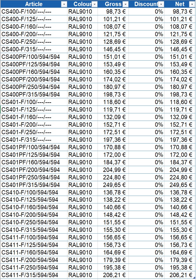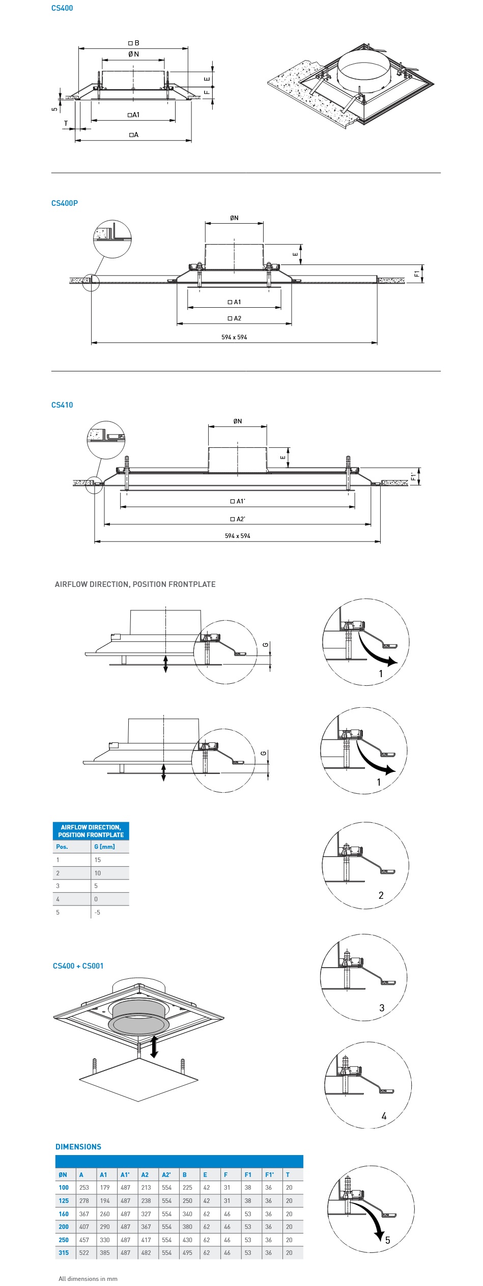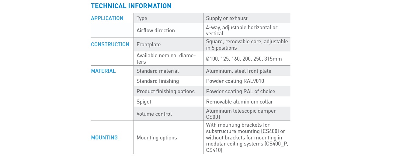 Difúzor CS400 je architektonický hliníkový stropný difúzor so 4-cestným prúdením vzduchu a nastaviteľným jadrom. Prednú dosku je možné nastaviť do 5 rôznych polôh, aby sa vytvorilo vertikálne, alebo horizontálne prúdenie vzduchu (kúrenie/chladenie). Difúzor sa štandardne dodáva s konzolami pre montáž na podkonštrukciu, ale je k dispozícii aj pre montáž do modulárnych stropných systémov. Je vhodný pre prívod aj odvod vzduchu. Difúzor je vyrobený z hliníka, predná doska z pozinkovaného oceľového plechu. Difúzor je štandardne práškovo lakovaný vo farbe RAL9010.