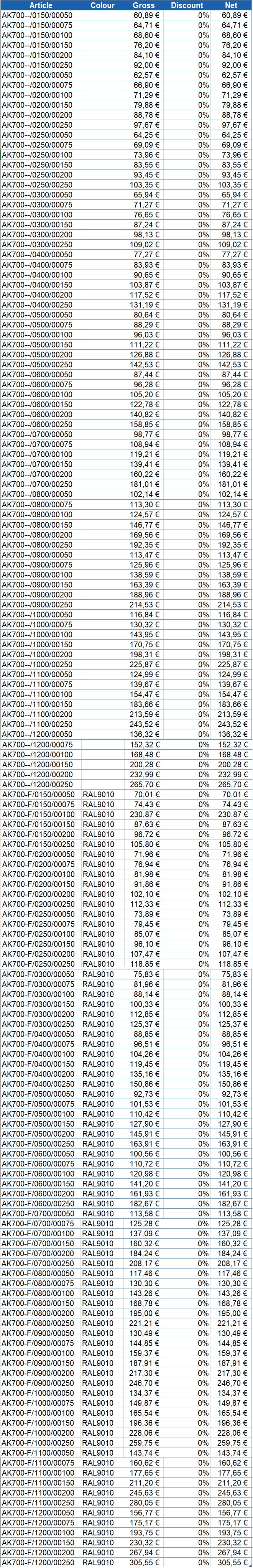 Hliníková podlahová mriežka AK700, vhodná na prívod a odvod chladeného, alebo ohriateho vzduchu, s rovnými lamelami, alebo s vychýlením 15 °. Mriežku je možné namontovať do podlahy. Štandardne dodávané s montážnymi sponami, k dispozícii sú rôzne možnosti upevnenia. Štandardná povrchová úprava eloxovaný satén.