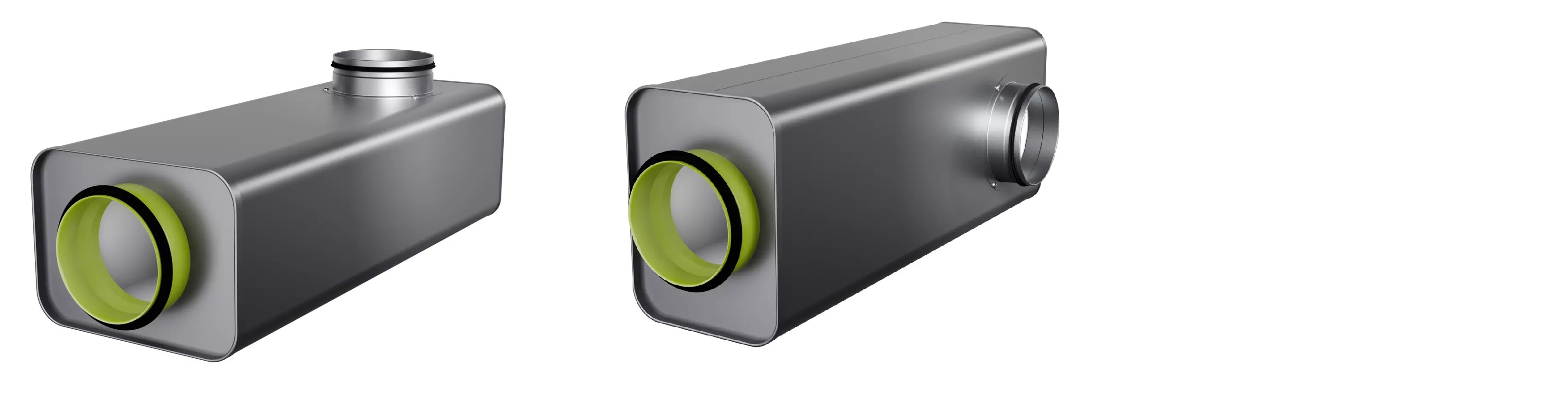 Obdĺžnikový tlmič zvuku s kruhovými pripojovacími hrdlami. Jedinečné vlastnosti týkajúce sa výšky, triedy požiarnej odolnosti, odolnosti proti migrácii vlákien a slabého zvuku. Patentovo chránené samonosné povrchové obloženie voči migrácii vlákien a riešenie koncových stien.