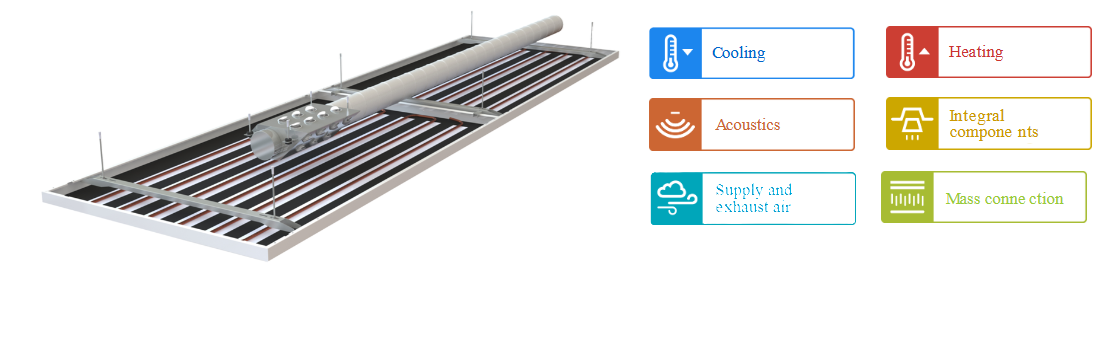 Hybridný sálavý systém. Chladenie až 125 W/m² (ΔT: 8 K), vykurovanie až 117 W/m² (ΔT: 15 K). Prívod vzduchu cez kruhový kanálový tryskový difúzor.