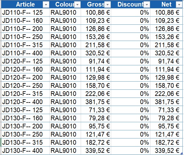 | kód | Typ | Veľkosť | 25 dB(A) | 30 dB(A) | 35 dB(A) |