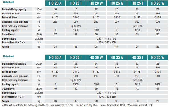 V skutočnosti môžu odvlhčovače HO odvlhčovať, chladiť, ohrievať a vymieňať vzduch rekuperáciou tepla z vytlačeného vzduchu. Modulačné EC radiálne ventilátory poskytujú vysokú prevalenciu a optimalizujú spotrebu energie. Použitie špičkových komponentov v oblasti chladenia, hydraulických, vzduchových a elektrických komponentov robí z jednotiek HO najmodernejšie odvlhčovače z hľadiska účinnosti, spoľahlivosti a tichej prevádzky. Ultra-vysokoúčinný krížový rekuperátor tepla zaručuje účinnosť nad 85% a je možné nastaviť aj intenzitu čerstvého vzduchu v 5 krokoch. Je možné spravovať jednotky prostredníctvom domácej automatizácie vďaka štandardnému pripojeniu Modbus RS485.