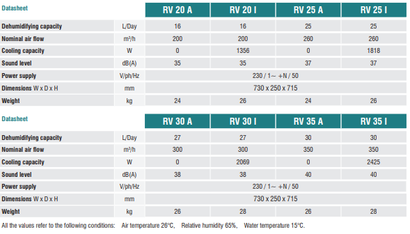 Vertikálne nástenné polypropylénové odvlhčovače série RV sú navrhnuté na použitie v občianskych, rezidenčných a komerčných prostrediach (posledné majú malé rozmery) s vysokou latentnou záťažou, kde sa vyžaduje prevádzka 24 h/deň.